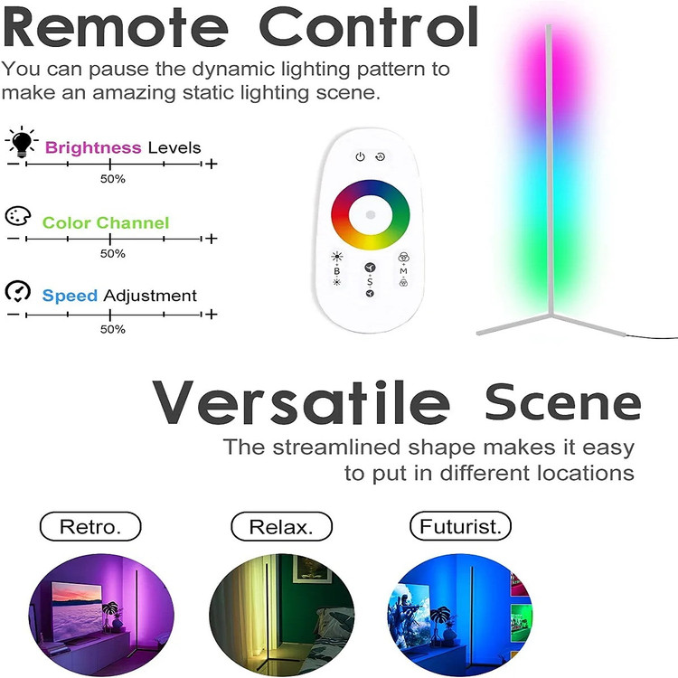 کرنر لایت یک محصول لوکس و شگفت انگیز است که با نورپردازی هوشمندانه خود می تواند زیبایی و آرامش خاصی را مهمان خانه ها و یا محل کار شما کند. از قابلیت های اصلی این دستگاه می توان به موارد زیر اشاره کرد: _قابلیت ایجاد بیش از یک میلیون رنگ متفاوت و 100 افکت نوری(حالتهای تغییر رنگ). __قابلیت کم و زیاد کردن شدت نور. _حالت فلش نور در رنگ های متفاوت و ثابت. و چندین قابلیت متفاوت دیگر. این محصول با طراحی مدرن و خاص خود کمترین فضا را اشغال کرده و همانطور که از اسم آن پیداست در یک کنج از محیط شما قرار می گیرد. این کالای زیبا و پرطرفدار برای مکان های متفاوت مثل اتاق خواب، اتاق کودک، سالن پذیرایی، اتاق نشیمن، دفتر کار، سالن های زیبایی، آتلیه عکاسی، باشگاه ورزشی، استودیو آهنگسازی، استودیو طراحی ،مراکز بازی مانند گیمنت ها و ... مناسب می باشد، که می توانید با کمترین هزینه بهترین تغییرات را در محیط اطراف خود ایجاد کنید. میزان نور این مدل برای روشن کردن یک فضا به مساحت 40متر مربع کفایت میکند.ریموت کنترل این مدل دارای color picking ring میباشد که نورپردازی را بسیار راحت تر کرده و همچنینی میتوانید حالت های مختلفی را متناسب با جو و فضای محیط برای نورپردازی انتخاب کرده یا حتی همزمان چند رنگ دلخواه را به عنوان ترکیب مورد علاقه خود انتخاب کنید.جنس پایه ها و بدنه این مدل از فلز مرغوب تهیه شده که با نمونه های داخلی بی کیفیت قابل مقایسه نمیباشد و همچنین دارای اداپتور میباشد تا از نوسانات جریان برق جلوگیری کرده تا اسیبی به دستگاه وارد نشود.ارتفاع این مدل 140 سانتی متر میباشد.در این مدل شدت و سرعت تغییر نور قابل کنترل می باشد.ترکیب چراغ های ال ای دی و اس ام دی بکار رفته باعث تراکم بالای نوری شده که آن را از مابقی نمونه ها متمایز می نماید